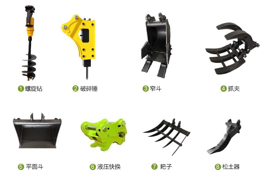 1.8T挖掘機(jī)還可以搭配螺旋鉆、抓夾、耙子、松土器、窄斗等屬具使用,滿足不同的施工場(chǎng)合。