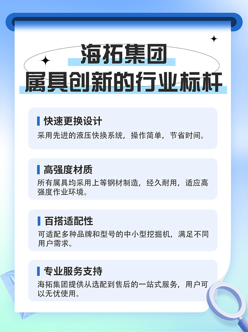 作為工程機(jī)械領(lǐng)域的深耕企業(yè),海拓集團(tuán)長(zhǎng)期致力于中小型挖掘機(jī)及其配套屬具的研發(fā)與制造。其產(chǎn)品以高適配性、高耐用性和高性價(jià)比著稱,廣泛應(yīng)用于市政、園林、農(nóng)業(yè)等多個(gè)領(lǐng)域。此外,海拓提供完善的售后服務(wù)和技術(shù)支持,確保設(shè)備在各類工況下穩(wěn)定運(yùn)行。
